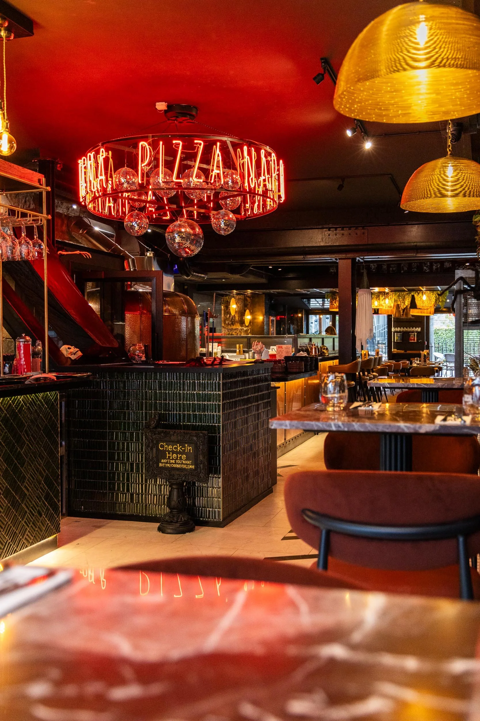 The undisputed showpiece of Social by Matto is the custom rotating real glass neon and sparkling disco ball installation — a bold and playful statement piece that instantly captures attention. Each section of the neon was meticulously hand-blown and filled with neon gas, producing that unmistakable rich red glow synonymous with classic neon craftsmanship.